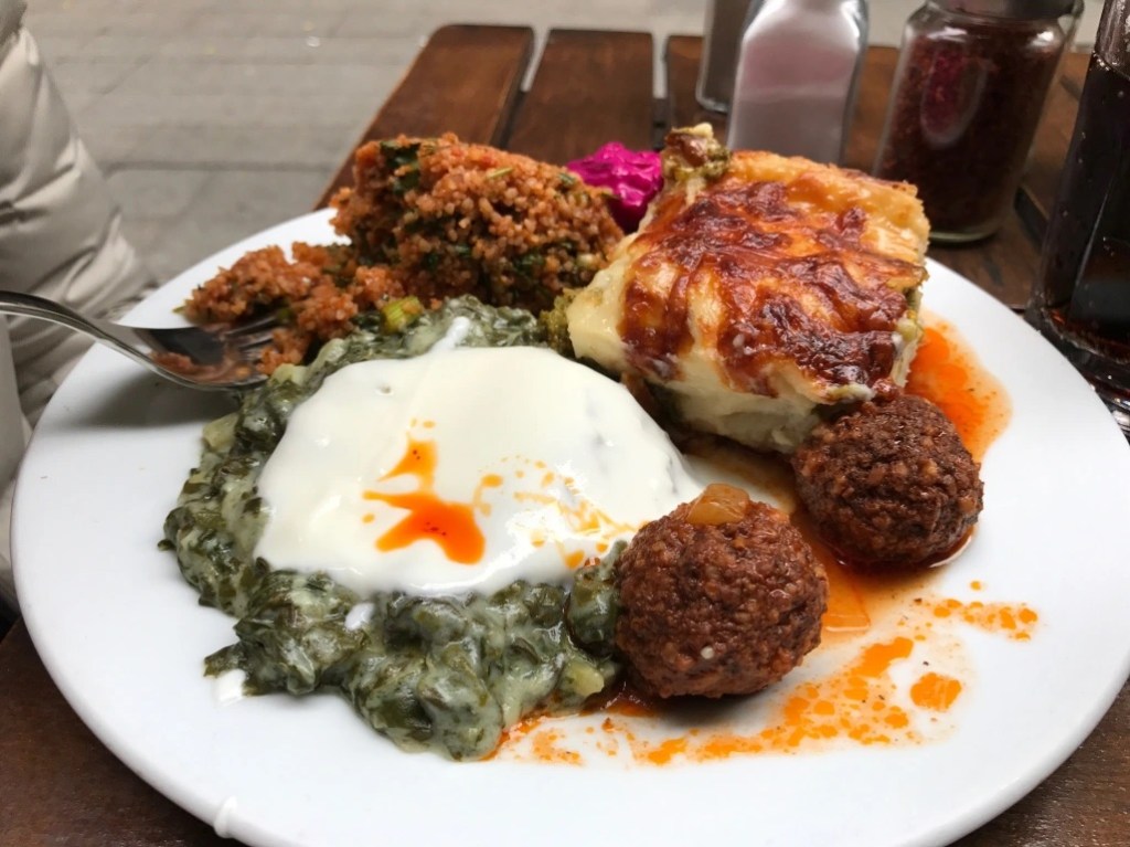 Además también hay un local que nos encantó con especialidades turcas que se venden por porciones y pagas por lo que te sirvas. Se llama Helvetia y está entre las calles General Yazgan Sk y Sofyali Sk, en un callejón haciendo esquina cerca de la avenida Istikal. Allí comimos por algo menos de 12€ y la verdad que fue donde mejor comimos de todo el viaje a pesar de que tuvimos que esperar para coger mesa.
