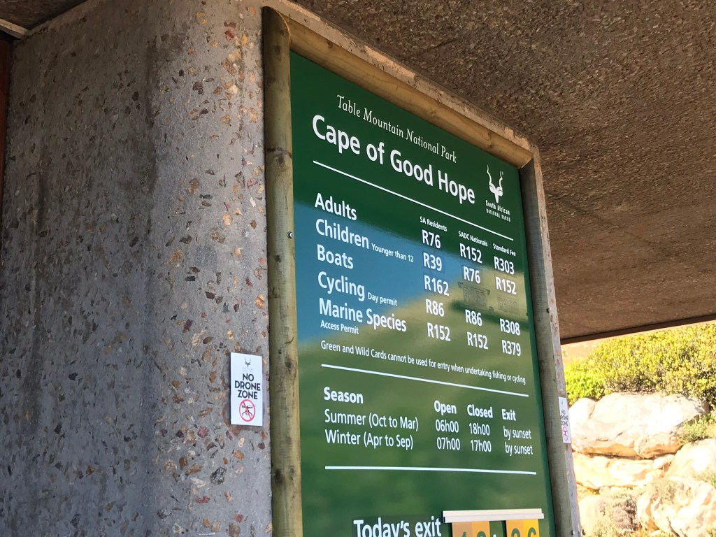 La entrada para visitar esta zona de la Península del Cabo (Parque Nacional Table Mountain) es de 152 RD (7.60 €) y nuestro consejo es que vayáis tempranito (antes de las 10 hrs) porque si no, veréis como se agolpan grandes colas para entrar a este parque nacional.