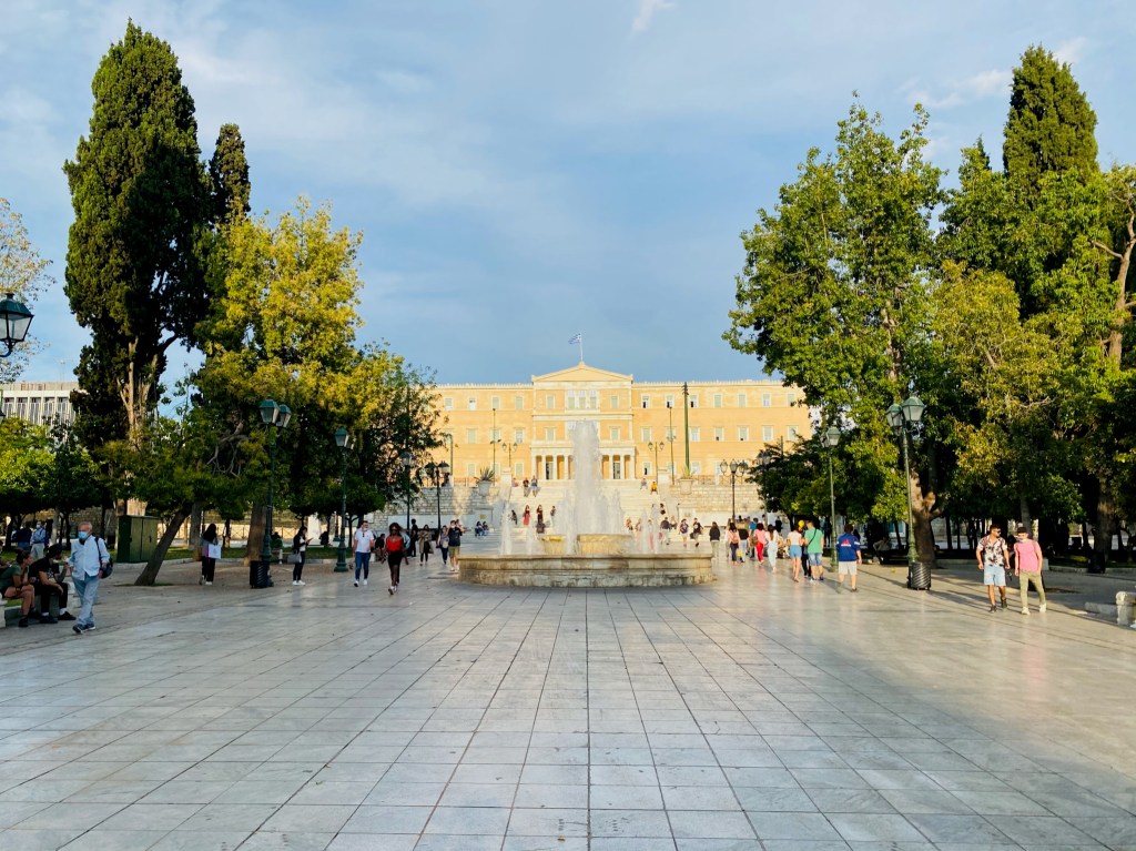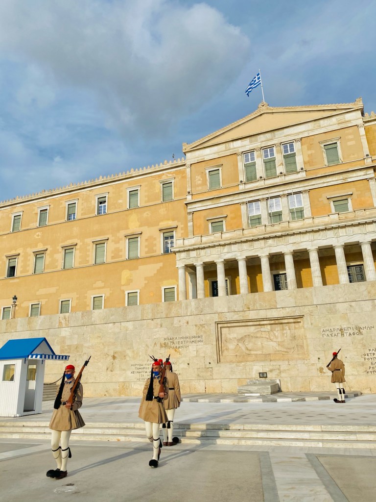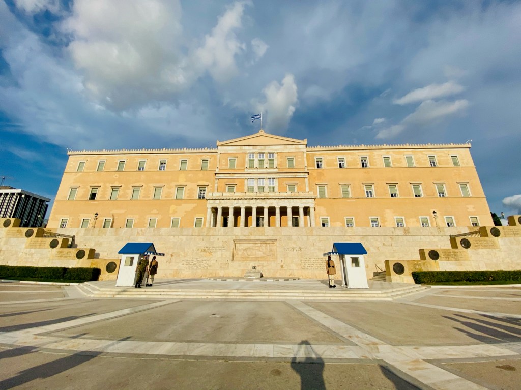 Al final de la calle Ermou, os encontraréis con otra importante plaza de la ciudad, plaza Syntagma. Es en esta plaza donde está ubicado el Parlamento griego. Justo a los pies del Parlamento se encuentra la tumba del Soldado Desconocido que se custodia todo el día por dos guardias vestidos con uniforme tradicional y es el lugar donde cada hora impar del día se lleva a cabo el cambio de guardia. Es otro de los atractivos de la ciudad y que no os podéis perder. Esta plaza también es famosa por ser el punto de encuentro de los ciudadanos atenienses.