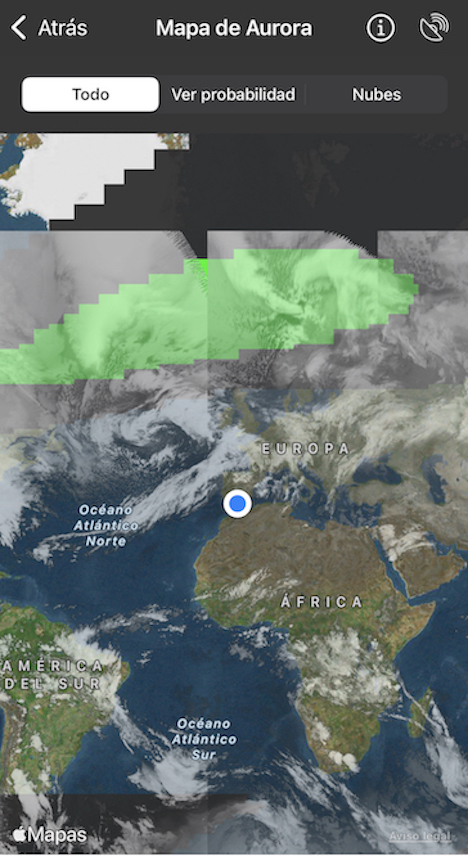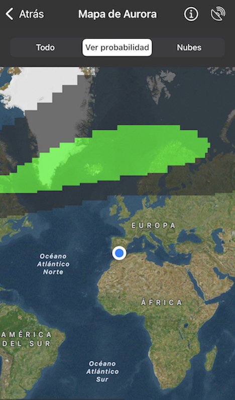 MAPA DE AURORAS: refleja las zonas donde “supuestamente” (ya que es difícil precisión exacta) se están produciendo auroras y el porcentaje de visibilidad.