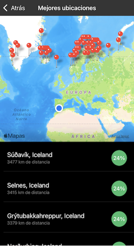En la interfaz de la aplicación tenéis dos áreas principales en la parte central que son mapa de auroras y mejores ubicaciones. Además en la parte inferior hay otras como registro, galería… etc de las que hablaremos más adelante.
