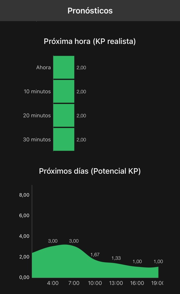 ÍNDICE KP: es el índice por el que se mide la intensidad de las auroras y va en una escala de 1 a 5 siendo la última la más alta.