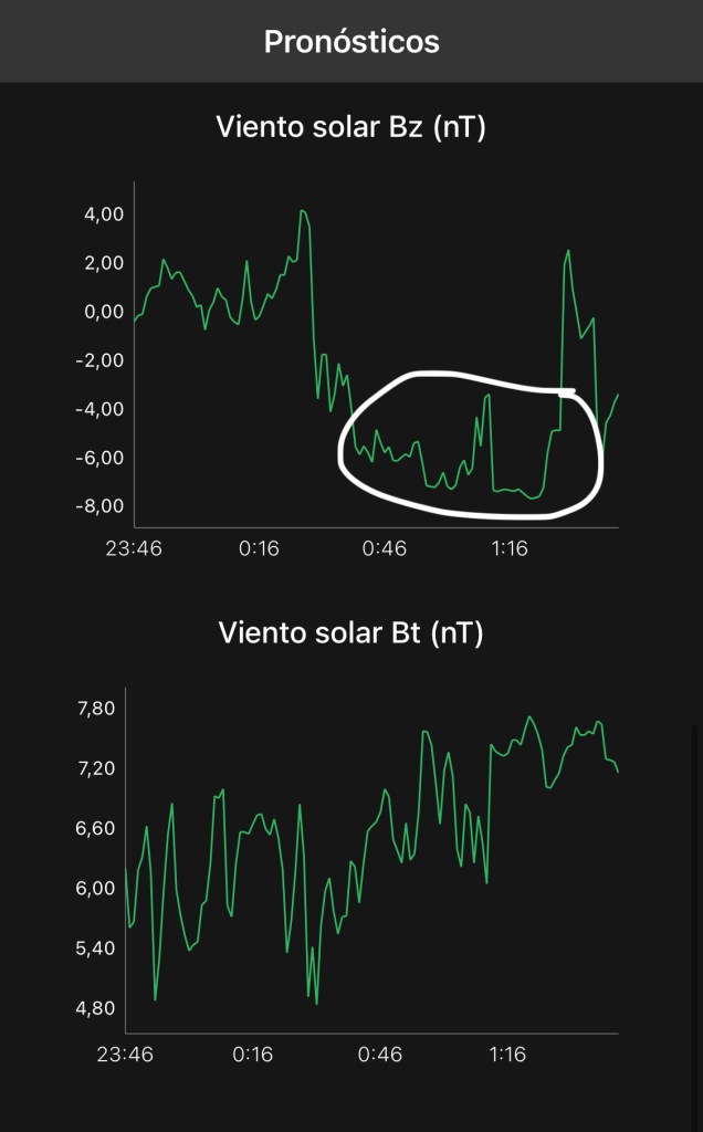 En nuestro caso, el índice KP que tuvimos rondaba los 2 – 2,5 que no es excesivamente alto pero tuvimos unos vientos solares bz negativos que nos hizo ver las auroras tal y como veis en las fotos del post.
