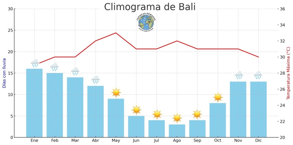 Debido a su ubicación geográfica, Bali cuenta con un clima tropical que se divide en dos estaciones principales: la estación seca, que va de junio a octubre, y la estación lluviosa, que se extiende desde noviembre hasta mayo.