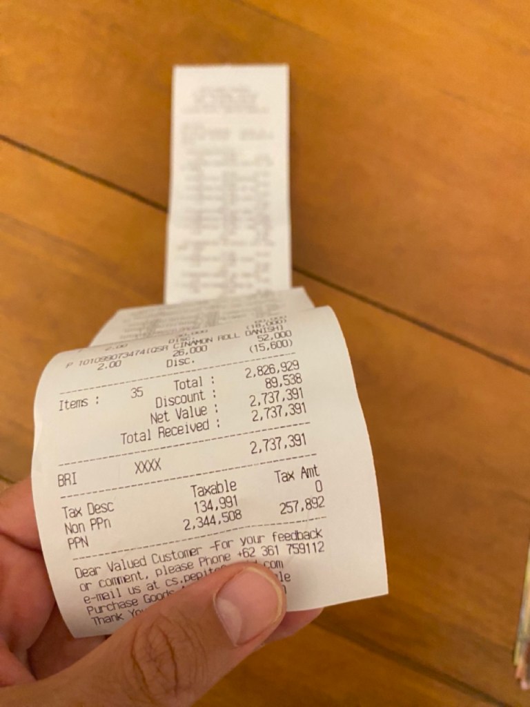 En cuanto a los precios en Bali no es algo que os tenga que preocupar puesto que es bastante asequible. La moneda local es la rupia indonesia y 1€ equivale aproximadamente a unas 19.000 rupias indonesias. En Bali si os alojáis en villa, tenéis la opción de comprar en supermercados ya que hay bastantes, destacando una cadena «Pepito Market». Aunque las compras en el supermercado sean millonarias, como esta que hicimos el segundo día, apenas fueron 140€ para surtir de víveres nuestra villa.