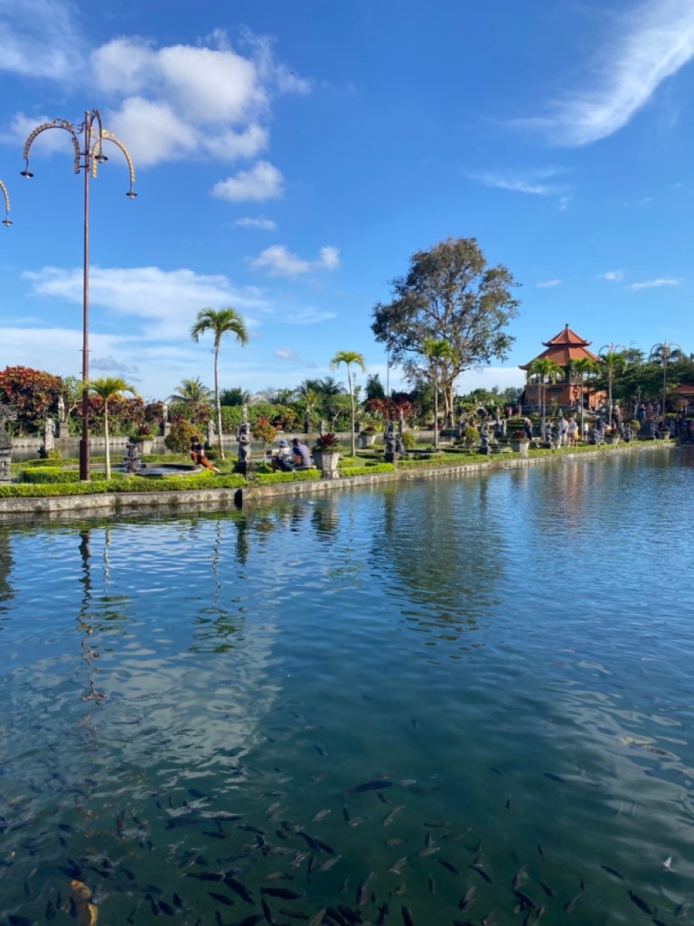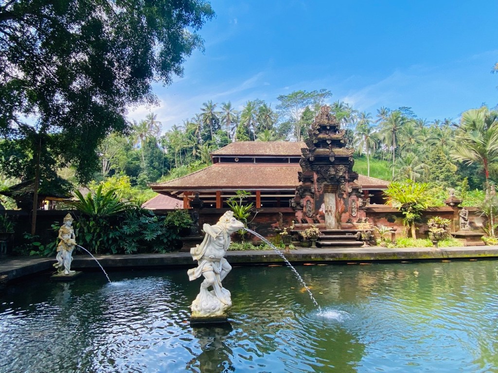 El elemento más icónico del complejo es el estanque con pasarelas flotantes de piedra, donde los visitantes pueden caminar entre esculturas de peces koi y fuentes decorativas. Aunque no es un templo en el sentido tradicional, Tirta Gangga es considerado un lugar sagrado que combina arquitectura, espiritualidad y naturaleza.