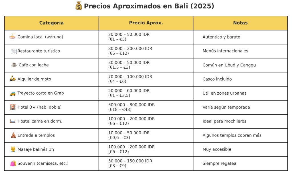 Aquí os dejamos un tabla resumen de algunos precios orientativos que os podéis encontrar en la isla: