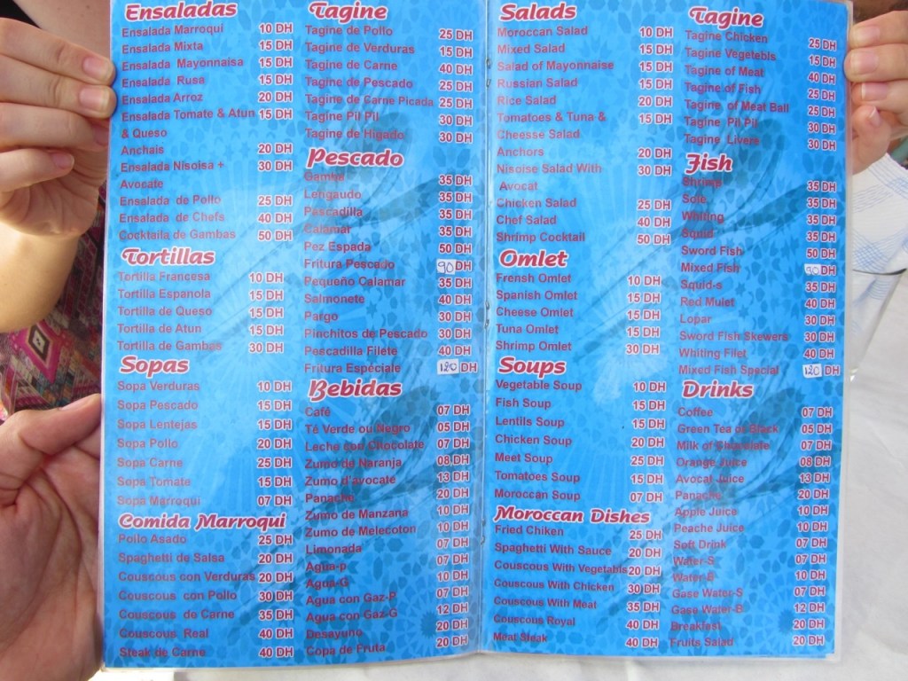 Si vais a Asilah allí encontraréis restaurantes aún más baratos todavía que en Tánger. Nosotros encontramos un restaurante que tenía muy buena pinta, cerca de la entrada a la Medina de Asilah y comimos por unos 50 dirhams (5 €) con bebida incluída.